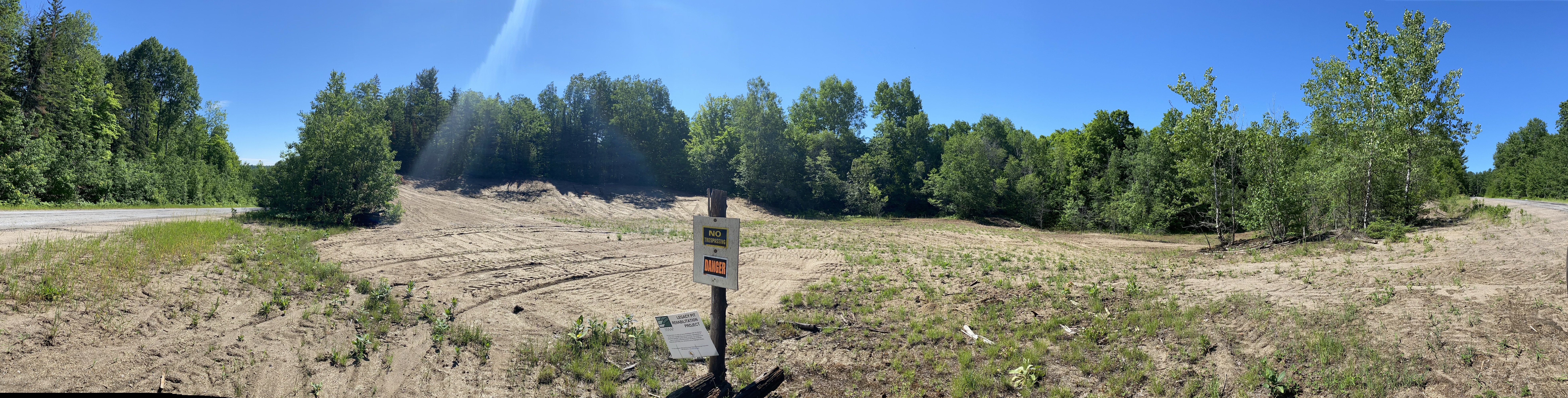 Area ~4,300m2 Volume ~700m3. The Anderson pit, located near Maynooth Ontario, had very sandy exposed faces at each end with no recoverable organic soils to be used for rehabilitation. Minor grading was required to reduce the sheer faces, but the rehabilitation plan primarily relied on the application of hydroseed. Northern Ontario seed mix was applied in a “Verdiol Biotic Earth Black” hydraulic growth media across the site. After one year of drought conditions, vegetation was well established on shaded slopes that prevented desiccation. Other areas of the pit were patchy and did not do well. After consultation it was decided that low success areas would be reseeded. MAAP continues to monitor the site and make recommendations as it progresses.